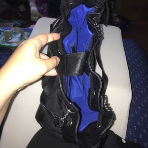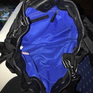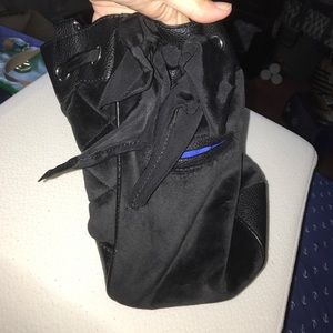 Used 1x Juicy Couture black velvet bag with leather bottom in great condition. There are small jewels on front of bag and all are intact. Royal blue interior and 2 side pockets located under side bows. Offers are welcome