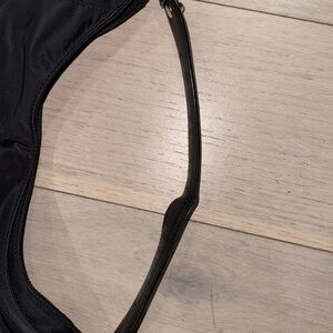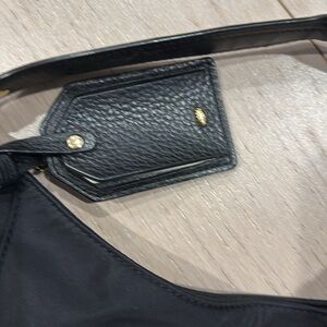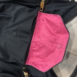 Preowned black purse with pink inside. Side pocket on both sides back pocket. Front magnetic pocket. Inside zipper pocket. Inside 2 pockets for keys or phone. Roomy inside compartment. Shoulder strap nice thick. Great condition a few scuff marks see pictures.