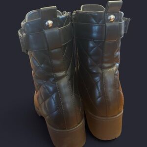 bling accents, combat style, heeled boots, metallic finish, goth fashion, statement footwear, casual distressed, logo detail, platform boots, size 8