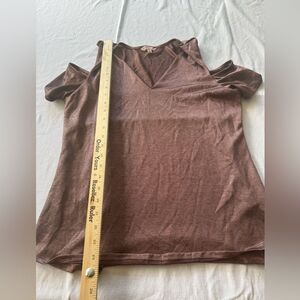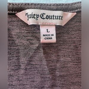 This is such a great top! Juicy Couture. It has a slight cold shoulder. V-neck. It almost looks like a pink/black/purple? Metallic. It’s a wonderful top! Pair with black pants for a night out!