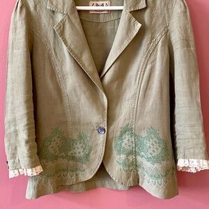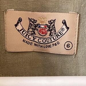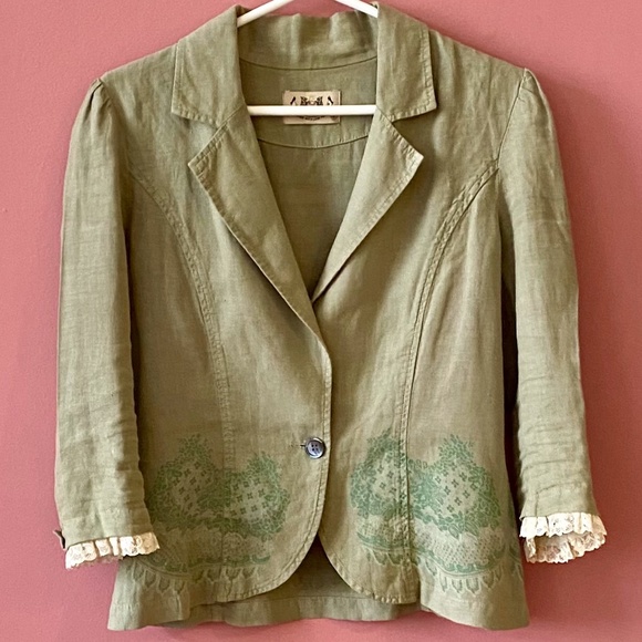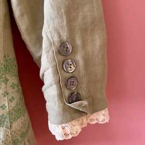Juicy Couture fitted Green Linen Jacket size 6 with quarter length sleeves with cream colored lace cuffs. Patterned details across the bottom of the jacket.