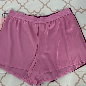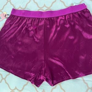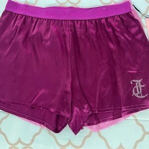 NWT 2 pack Juicy Couture pj shorts. Silky soft material. Purple shorts has “Juicy Couture” logo written in script all over shorts and waistband, with “JC” embellished logo on front of shorts. Pink shorts has Juicy embellished logo on back, Juicy Couture logo in script on waist band.