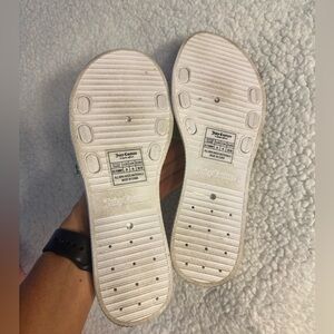 This is a pair of juicy couture women’s rainbow rhinestone slides, size 8. I wore them once and realized I don’t like slides, I prefer flip-flops. There is one small defect that I pointed out in a picture. They also have a ripple type effect on the rhinestones that I tried to show in the video. Please look at pictures and video closely. These come from a smoke free, pet friendly home. They are in excellent used condition.