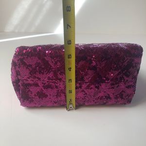 Juicy Couture sequin sparkle cosmetic bag includes a toiletry bottle perfect for traveling.