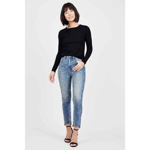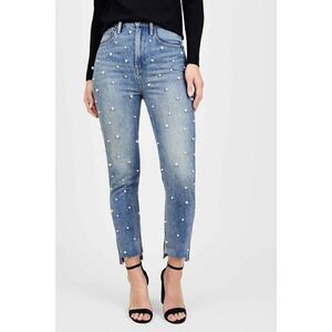 Juicy Couture High Rise Pearl Embellished Denim Girlfriend Style Jeans Raw hem.