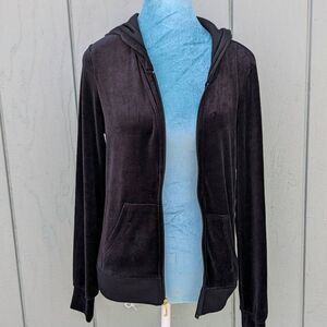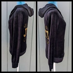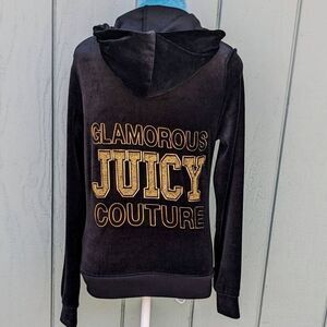 Pre-owned/pre loved 2000s Juicy Couture Black velour tracksuit jacket with blinged out words on the back " Glamorous Juicy Couture" in large gold metallic letters. Zip up closure in front. Hooded. No wear. **The jacket looks faded in some photos, but it's just the lighting