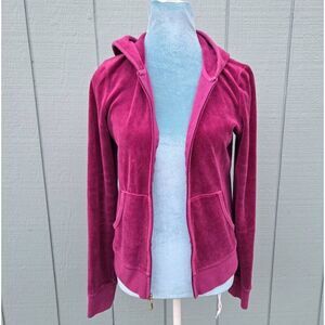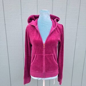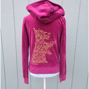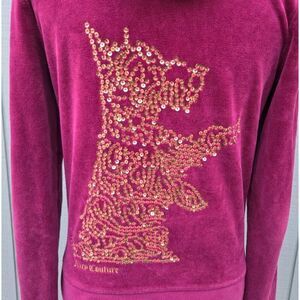 Vintage/Y2K/2000s, rare, hard to find, and sought after Juicy Couture velour tracksuit zip up hoodie in a darker magenta pink color with a large Scottie Dog made up of gold sequins on the back, and embroidered "Juicy Couture" underneath. Two front pockets. Hooded. Excellent condition, other than some slight tarnishing? on the "J" zipper pull.