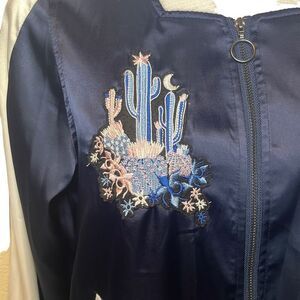 Juicy Couture Y2K Vintage Navy White Cactus Applique Satin Bomber Jacket Small
