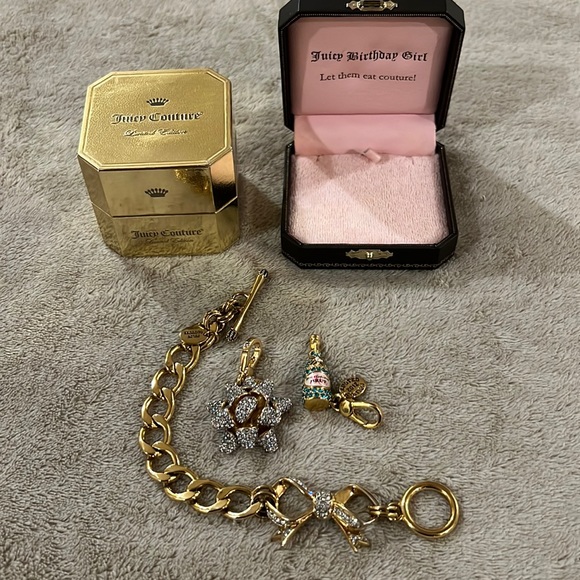 Two charms that are in like new condition and an excellent bracelet. Boxes are in decent shape but the brown one is beat up in the back and on the bottom. I was collecting these but now I’m not 👀❤️🤷♀️. I paid $100 plus for each charm and over $50 for the bracelet. The brown box is not