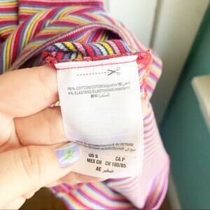 Juicy Couture Dress Knit Midi Rainbow Striped V-Neck Side Slit Snaps Size Small {S}. A striped, sporty take on the midi dress. Juicy Couture's fitted style hugs your curves and looks great with sneakers. Bodycon. Slight ruffles at the sleeves add a femme touch. “Juicy” brand name patch on left chest. Very good, preowned condition. Pullover style. 3/4 length sleeve with slight ruffle at cuff. Logo on chest. Side slit with snaps. Material Content: Cotton, elastane blend. Machine washable. Thermal style material feel.