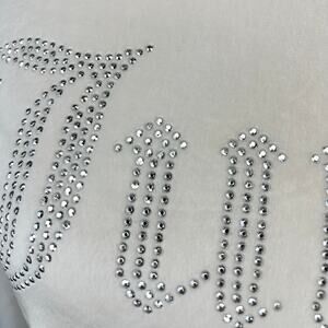 Super cute Y2K ivory color light weight hoodie, cropped with a silver bling juicy logo front lettering, juicy couture drawstrings, fitted wrist, and in excellent condition.