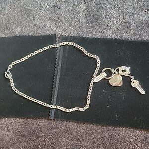 Juicy heart key lock silver necklace with rhinestones on lock and key.