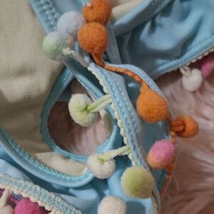 Adorable blue swimsuit with ruffled details and colorful pom pom trim. Perfect for a fun day at the beach.