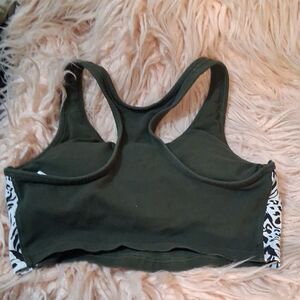 Stylish dark green sports bra with zebra print sides. Ideal for active wear.