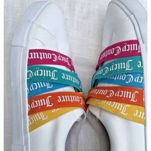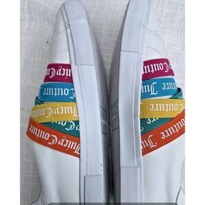 White leather with multi color brand logo slip on style Sneaker bands are elastic. Gold crown on rear heel