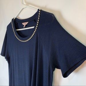 Navy with rhinestone trimmed scoop neck.