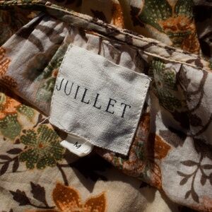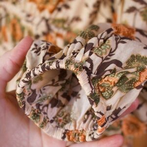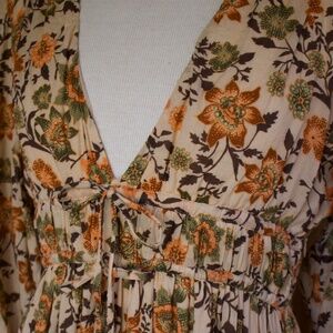 Dôen vibes! Perfect condition, new without tags 100% cotton dress. Juillet is mainly known for their swimwear, however this long sleeve dress was released with their Oona sunflower print. Zipper at the side, elastic at the bust and waist with belt ties, metal hardware, plunging v-neckline. Gorgeous boho and flowy long sleeve, has a tailored feel with the thoughtful pleats. Maxi in length, tiered, with an incredible fall floral harvest pattern.