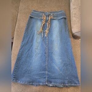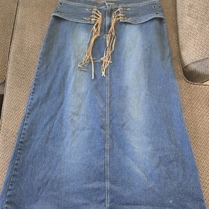 Jukebox Denim Fringe Maxi Skirt Women Sz 16 Blue Flare Back Slit Waist Belt