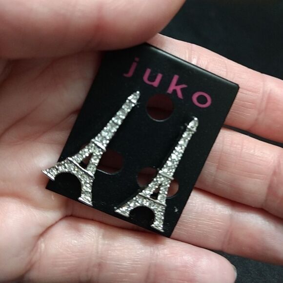 Pretty silver tone Eiffel tower earrings with clear rhinestones.