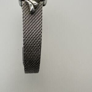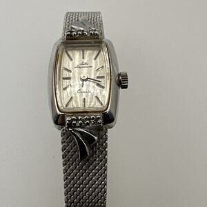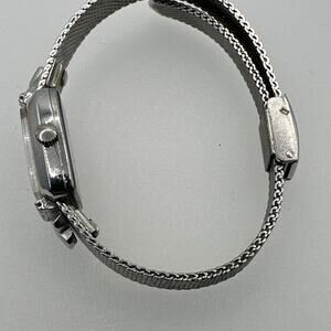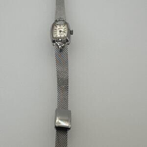 This is a lovely and very ladylike ladies watch by Jules Jorgensen. The watchcase measures approximately 15 mm not including the crown and is approximately 20 mm tall. The watch features tiny diamond accent and a stainless steel mesh strap. The strap sizing is adjustable and can measure up to about 6.75 inches.