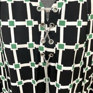 Versatile Green and Black Color Blocked designer print shirt dress by Jules & Leopold. Removable belt that ties at waist. Interesting silver chain and silver metal grommets at neckline. Tabbed Silver Button Sleeves. Size small. Polyester/spandex blend fabric is hand washable and travels well. Approximate measurements in photos. Excellent condition. No known flaws.