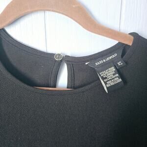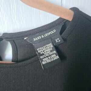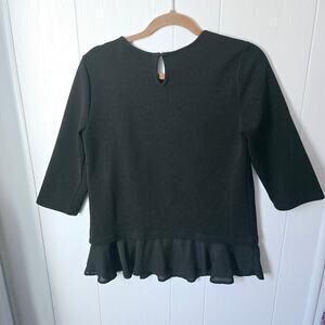 Jules & Leopold black ruffle hem blouse, size XS, in excellent pre-owned condition. Made of 95% polyester and 5% spandex with a chiffon ruffle trim at the hem. Features 3/4 sleeves, a back keyhole closure, and a flattering peplum-style silhouette for a polished look.