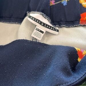 Charming retro-inspired pull-on ankle pants by Jules & Leopold. Navy blue with a bold red and white floral print. Features a flattering paper-bag waist with belt loops and a matching tie belt. Slim cigarette leg hits at the ankle. Made from a medium-weight, stretchy blend (89% polyester, 11% spandex) — perfect for spring and summer. Women’s size Small with a 24-inch inseam. Good pre-owned condition — minor pilling inside waistband and a small area on the back lower leg (see photos).