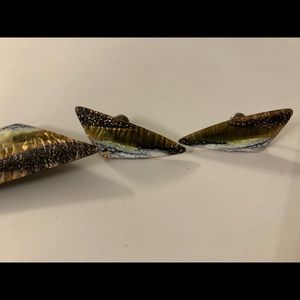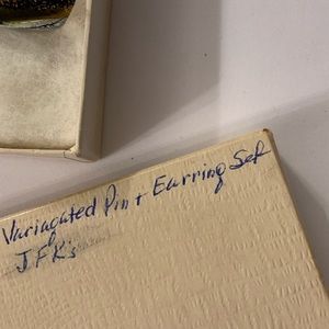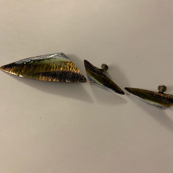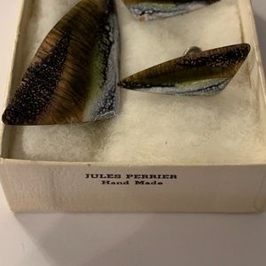 This is a vintage Jules Perrier hand made brooch and earrings in original box . Size of brooch is 3 inches x 1 inch . Chic. Sold as is .