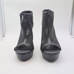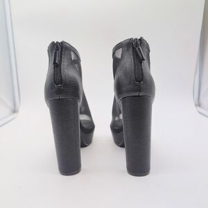 These sophisticated black heels feature a chic peep-toe design and a sturdy 4-5 inch heel, perfect for formal occasions. The combination of leather and mesh panels adds a modern touch, while the platform sole ensures comfort and balance.