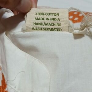Effortless elegance unfolds in this charming maxi dress. Geometric orange embroidery dances across the crisp white cotton, creating a captivating boho-chic vibe. This dress features a stand-up collar with a subtle v-neckline, voluminous 3/4 sleeves with elasticated cuffs, and a playful scalloped hem. Imagine yourself strolling through a sun-drenched farmers market or hosting a relaxed garden party in this beautiful dress.