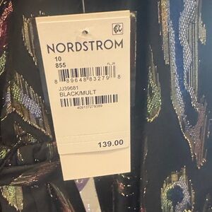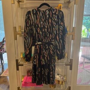 Chic 3/4 length sleeve dress with vibrant multicolor pattern. Tie at the waist with ruffle. Back zipper. Perfect for stylish outings.