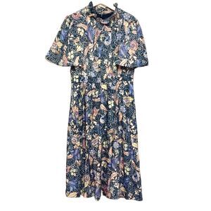 Colorful floral print in blues, pink, lavender and ivory enlivens this feminine midi dress.
