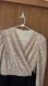 This velvet cream and black jumpsuit is in excellent condition. Features a deep V-neck wrap front with black belt that ties in the back. Long sleeve and sequins on the cream top. Pockets on the pants. Back zipper. Chest measures approximately 16 inches with some roomand waist is about 14 inches. Inseam is about 28.5 inches.