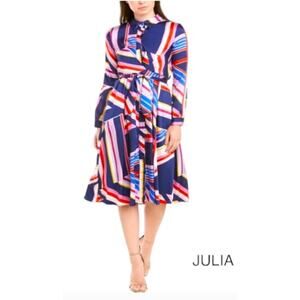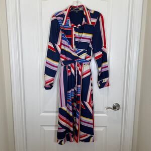 Dark blue, red, and vibrant multicolor geometric stripes print shirt dress by Julia Jordan. Features a criss-cross wrap-around tie belt sash. Long button-cuff sleeves, midi in length. There is one small factory flaw in the print on the back of one sleeve area (see pic #8). Bust across the front area measures approx. 18 inches.