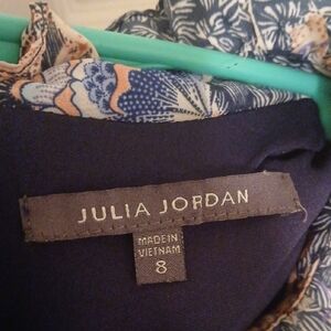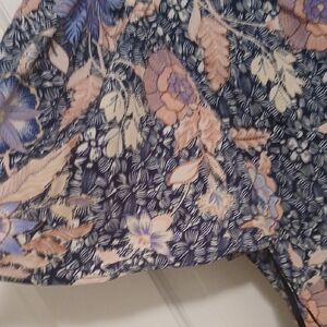Chic midi dress with vibrant floral patterns. Features a mix of purple, cream, and black. Ideal for stylish outings.