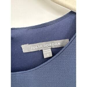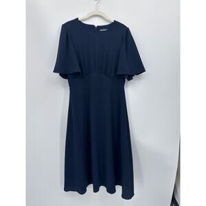 Elegant navy Julia Jordan midi dress in excellent condition. Features soft stretch crepe fabric, flutter sleeves, a crew neckline, and a flattering A-line silhouette with gentle gathering at the waist. Fully lined for comfort and a smooth fit. Perfect for work, events, weddings, or evening outings.