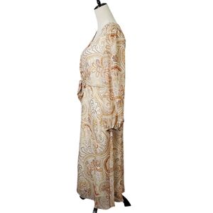 A beautiful boho paisley print dress from Julia Jordan-a warm color palette that is perfect for Fall!. The dress features a flattering v neckline, elegant bishop sleeves-elastic cuff, gold toned buttons down the length of the dress, fully lined. Bust measures approximately 17.5" flat, length measures approximately 47" from shoulder to hem. In excellent condition.