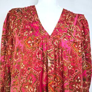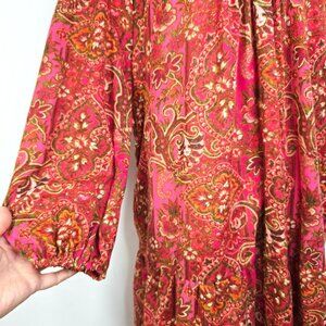 Julia Jordan Red Pink Floral Paisley Pleated V Neck Boho Tiered Flowy Maxi Dress