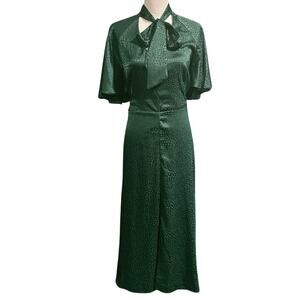 Chic and timeless, this Julia Jordan plus size midi dress features a vintage inspired silhouette in lustrous satin with a subtle tone-on-tone animal jacquard texture. The capelet-style flutter sleeves drape gracefully over the shoulders, creating soft structure and a unique, elevated look. A dramatic tie-neck halter detail adds polish, while the elastic waist, side zip closure, and front slit skirt deliver a flattering fit that complements curves. Fully lined and easy to wear, this figure-flattering style is perfect for weddings, holiday parties, or special occasions. Comes from a smoke free home.
