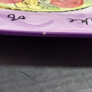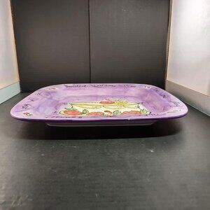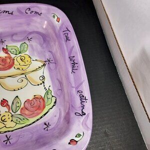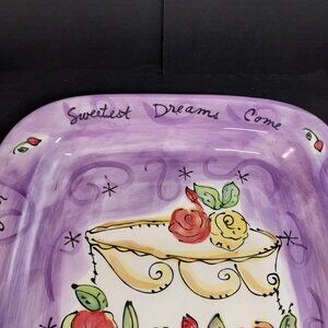 Julia Junkin for Certified International created this whimsical square cake plate with hand-painted detail and vibrant charm. A tiered cake decorated with roses sits at the center against a lavender background with swirling accents and starbursts. The border carries a cheerful message that reads: “May All Your Sweetest Dreams Come True While Eating Cake of Course!.” This ceramic plate is ideal for serving cake, desserts, or treats, and also works beautifully as a decorative piece. A wonderful choice for collectors of Certified International pottery or anyone who enjoys unique, artistic serveware. 1 small chip shown in photo.