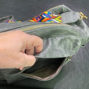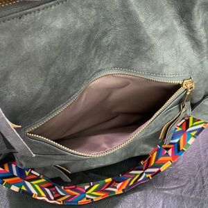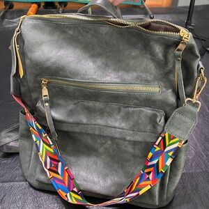 Julia Rose Backpack with reversible shoulder strap. Used once - Like new. No scratches or scuffs. Smoke Free Home. Color Gray with multi color shoulder strap.