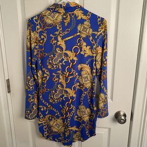 Reminds me of a Versace style print. Wear it as a shirt or a dress. Excellent preowned condition. No issues.
