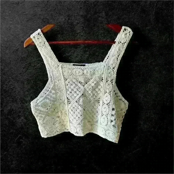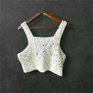 Women’s White Crochet Cropped Top with Sun Design- Size Large L , Cotton/Polyester Blend.