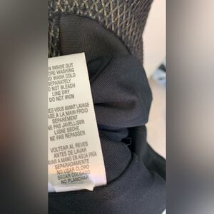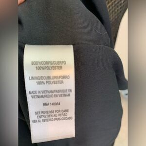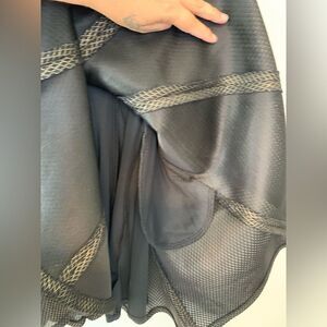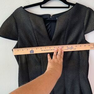 v-neck capped sleeves Black textured waffle overlay with a subtle metallic bronze hue Back zipper closure Excellent pre-owned condition minus the need to sew back on hook eye