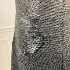 Julia Jordan sequin dress with black velvet, trim and black mesh cut out across the yoke. The sequin is disrupted in patches Intentionally, please see photos, and it is a deep, mermaid, murky green color that almost looks black, and actually does appear black in certain lighting. Side zip and lined. Fabric does have some stretch to it. The brand and size tag have been cut out but the fabric content tag is still attached to the inside seam and links to the Julia Jordan, RN number. Measurements are approximate and taken while laying flat: Measurements are approximate and taken while laying flat: 35 inches from shoulder to hem, 15 inches from armpit to armpit, 14.25 inches straight across the waist and 17.5 inches across the hip. It is featured on my size small dress form for reference, but please double check measurements to ensure the proper fit for you.
