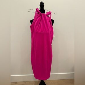 A season must-have for special occasions, this elegant red midi sheath dress created from crepe scuba fabric, features a sleevless twisted neckline, two concealed gold buttons with zip closure at the back, and a nipped waistline for form fitting silhouette.