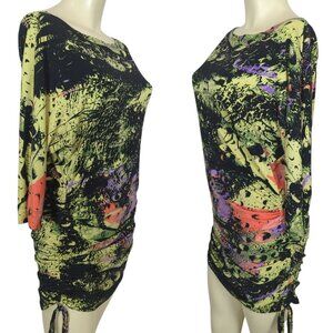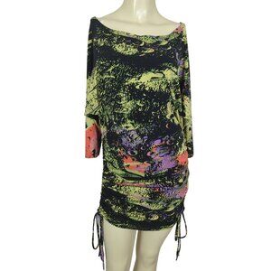 Julian Chang Abstract Art colorful Ruched Drawstring Mini Dress Dolman sleeves M