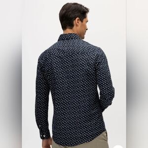 New Without Tags Julian and Mark Men's Size XL Ryan Long Sleeve button front geo print shirt, navy with gray and white spots, stretch, slim fit, timeless design and superior comfort perfect for any occasion. 97% cotton 3% spandex.
