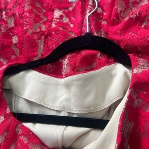 This striking red dress by Julian Taylor features a sleeveless design with a classic crew neck, perfect for cocktail events or as a wedding guest. The A-line silhouette and intricate lace overlay create a sophisticated and elegant look, while the midi length adds a touch of timeless charm. Worn once with no flaws. From a smoke free home.