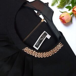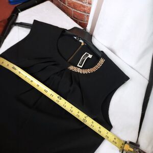 The Julian Taylor Women's Black Pleated Evening Dress is a stylish and elegant choice for parties and cocktail events. The sleeveless design, round neck, and knee-length hem give it a classic and sophisticated look. Made of a blend of polyester and spandex with a rayon fabric type, this dress offers a comfortable and flattering fit. The pleated accents add a touch of femininity, making it a versatile and chic option for various occasions throughout the seasons of summer, fall, and spring. The little gold tone chain detail at the neckline also adds a little edge.